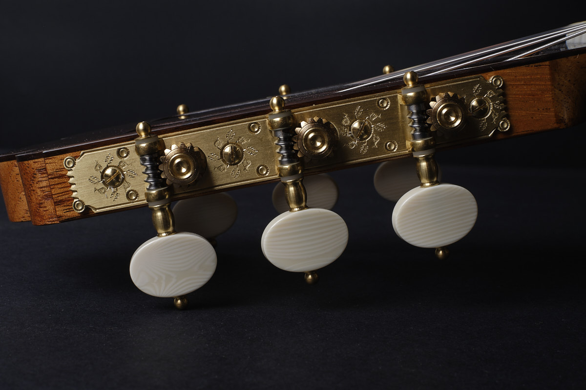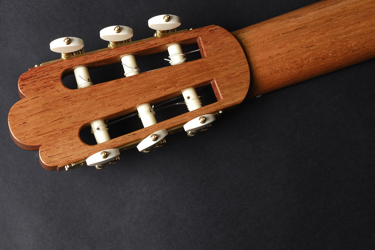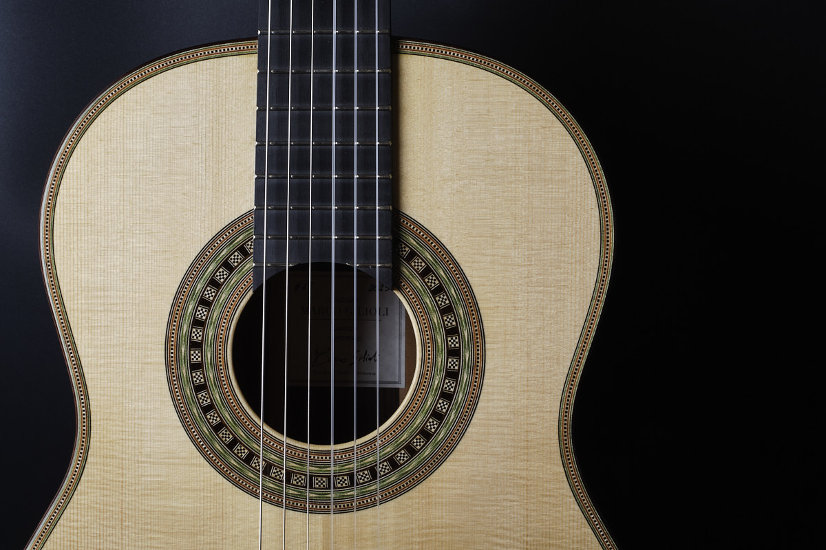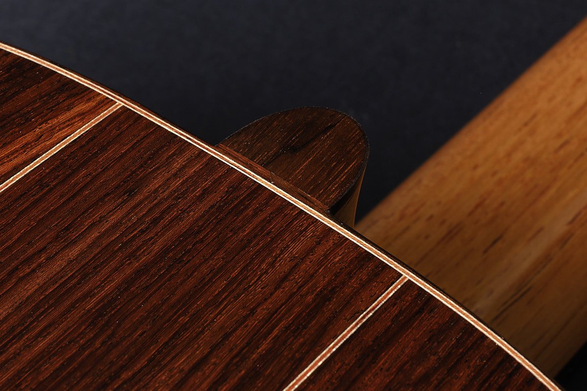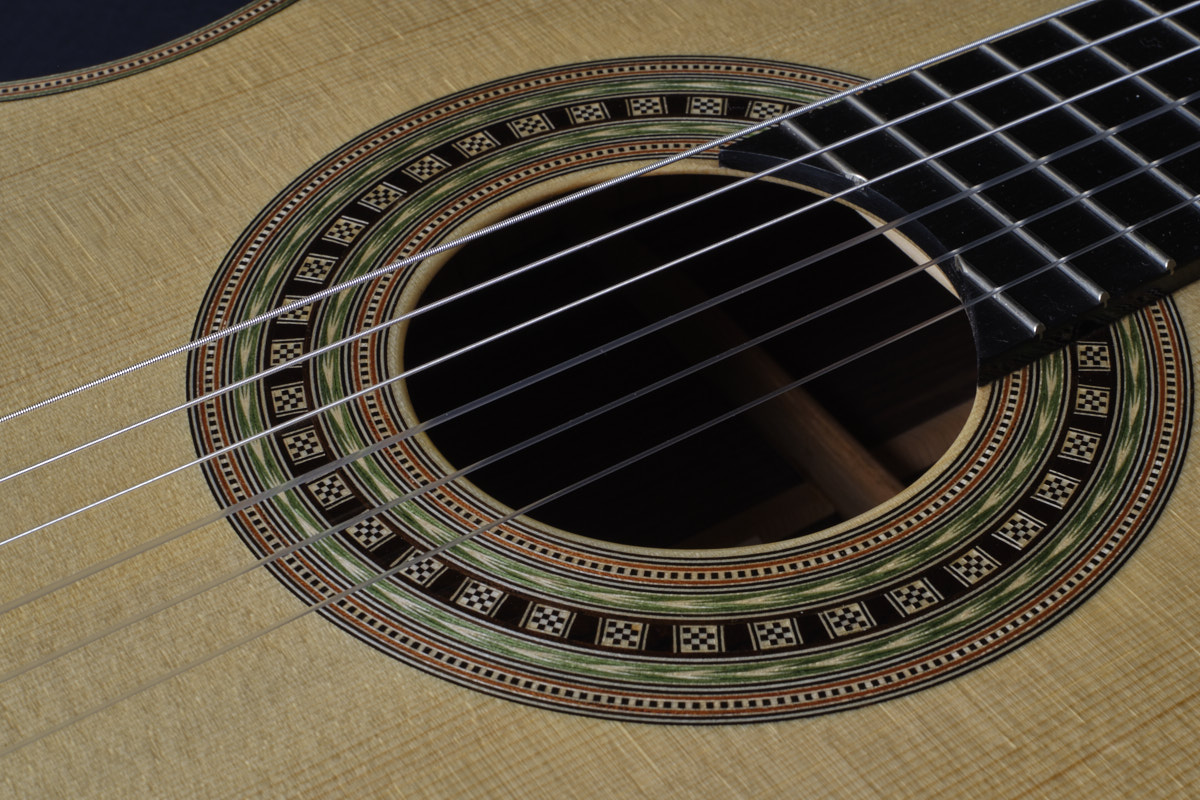 第一眼看到这把吉他时,最引人注目的是其制作的细致程度与精准度,尤其是音孔镶嵌图案:这是托雷斯最复杂、最具标志性的设计之一,在这把吉他上被以极高的忠实度和干净利落的工艺完美再现。仅仅是这个音孔装饰图案,就足以体现出吉廖利非凡的手工技艺水准。