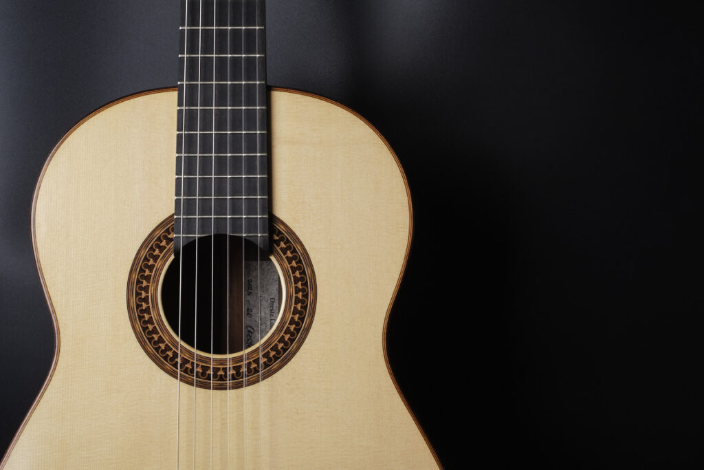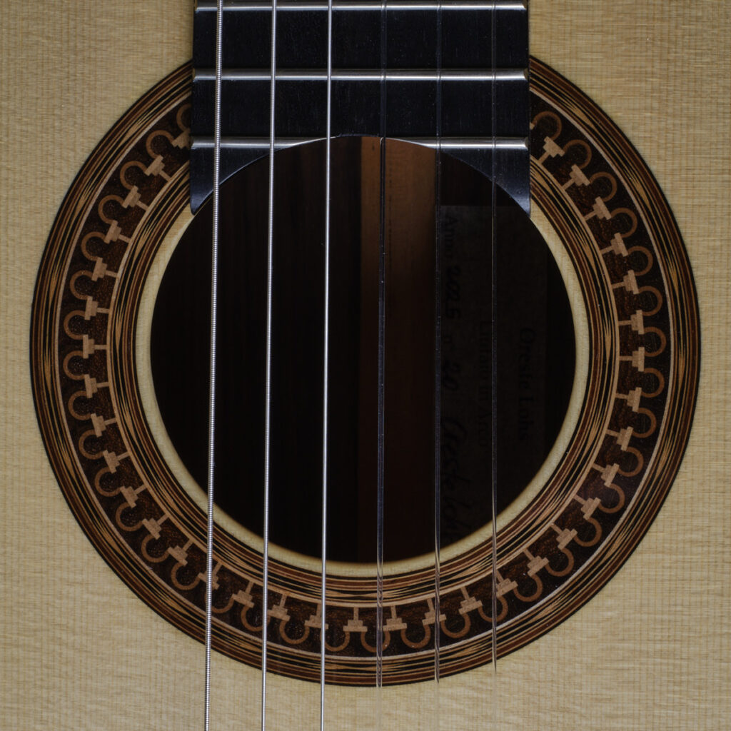在这把吉他的理念与精神中,我们可以感受到格拉纳达学派的回响:对轻盈感的追求、对清澈音色的探索、对细节的精致要求——但同时它也展现出个人的视角与独特的声音。一个很好的例子就是它美丽的音孔饰圈:这是对 José Luis Romanillos 标志性饰圈的个人再诠释,灵感来自科尔多瓦清真寺的拱门。这种饰圈在吉他制作界极具影响力并被多次再创作,而 Oreste 成功地向这一经典致敬的同时,也赋予了它一种手工感、细腻感与现代感,我们非常喜爱他的处理方式。