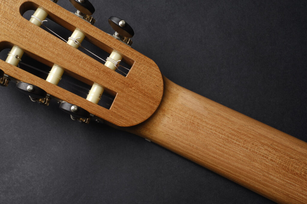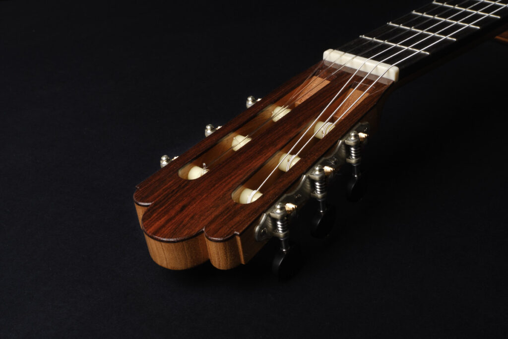 因此,我对吉他持有整体性视角,我认为它不仅仅是零部件的组合,而是一个受诸多因素影响的复杂系统,从原材料的选择到装配的方法,都对其有深远影响。我的建造方法不使用外部或内部模具,而是更倾向于一种传统启发的方式,更贴近感官体验;我追求无张力的结构方式,保持内在平静;遵循严谨流程以尽可能减少变量并明确影响结果的因素;在声音、音色与造型及其和谐关系中进行审美探索;保持结构一致性;并始终在错误与改正之间保持一种动态的对话。同时,与音乐家和其他制琴师的交流也至关重要。这种互动不仅加深了我对吉他之美的理解,也帮助演奏者在乐器中找到表达自身声音的媒介。