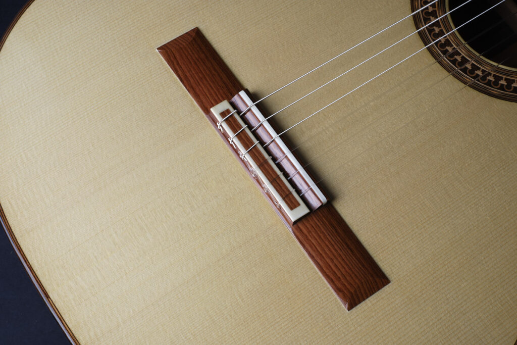 琴桥:马达加斯加玫瑰木(尺寸 190 x 28.3 x 8.6 – 8.4 毫米,重量 23 克)。第六弦琴桥处弦高为 10.6 毫米(第 12 品处为 4 毫米),第一弦琴桥处弦高为 9.6 毫米(第 12 品处为 3 毫米),分别在琴桥上方的骨料厚度为 2.0 毫米和 1.2 毫米。