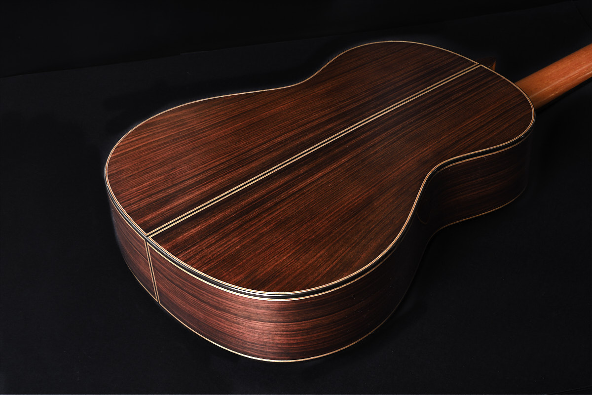 他的吉他呈现出高度的美学平衡,这源于他对乐器各个方面所持的一贯性原则。音木的选择与装饰元素和谐统一,造就了一把在视觉上极具冲击力的吉他。尤其值得一提的是他原创的音圈(rosette),它展现了他出色的工艺水平,也为吉他赋予了坚实与个性,带来一种视觉上的力量感,不仅与乐器的身份一致,甚至与其音色也相呼应。这是一个有连贯性、有存在感的音圈——它与整把吉他说着同一种语言。